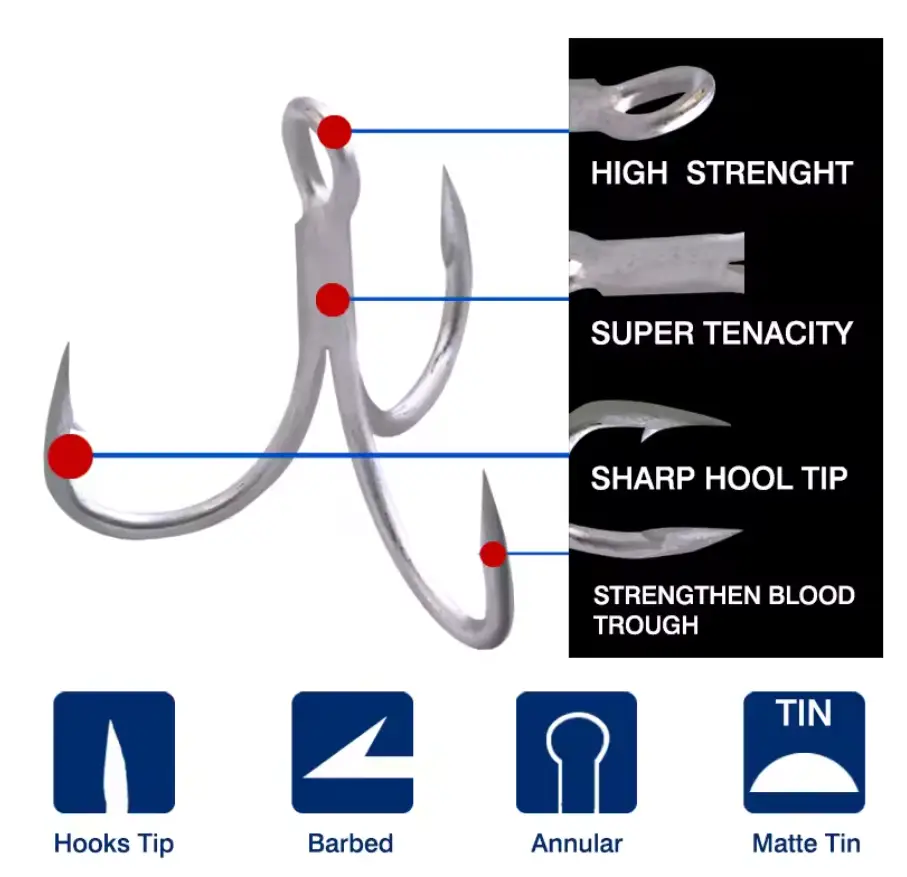 - עיצוב: עיצוב טרבל עם שלוש נקודות חדות ומעוקלות, המגדיל את הסיכוי לתפיסת הדג.